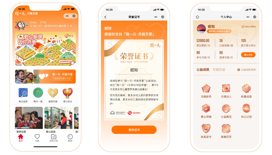 在“捐一元”16周年之际,百胜中国和中国乡村发展基金会共同推出“捐一元·月捐月爱”小程序,旨在创建一个公益大本营,让公众能以更加持久和便捷地方式参与公益活动。小程序中设有多种互动环节,包括月捐组队、每日公益答题、爱心留言等,参与者可以通过积分兑换公益福利,以及获得不同等级的荣誉证书。此外,通过小程序的“点亮爱心厨房”功能,用户可通过捐款来点亮爱心厨房受益地图,直观地看到爱心成果和项目的进展。