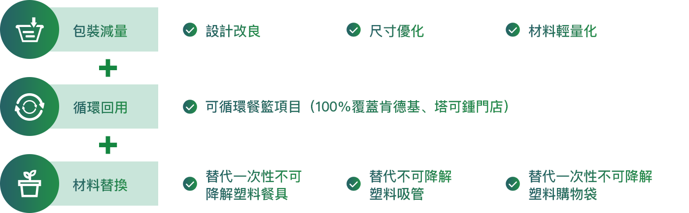 百勝中國嚴格遵守包裝相關法律法規,以4R原則為指導,制定一系列承諾及目標,並發佈《百勝中國包裝戰略》。我們以包 裝減量、循環回用和材料替換為主要手段,不斷尋找和應用更優的可持續包裝方案,以實現我們的可持續包裝承諾及目標。